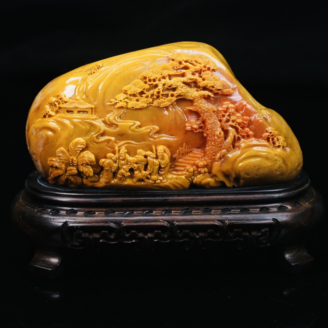 > ◆珍蔵◆中国古美術 清時代 古寿山石 田黄石彫り松下雅居図 置物 箱付 精品 細密細工造 置物 擺件 古賞物 骨董品 時代物 A68