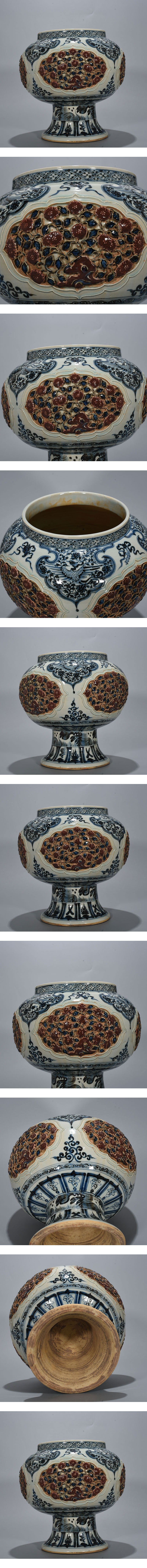 > ◆珍蔵◆中国古美術 元代 元青花 釉里紅 捏花 古陶磁 八宝高足罐 細密細工造 置物 擺件 古賞物 骨董品 時代物 A33
