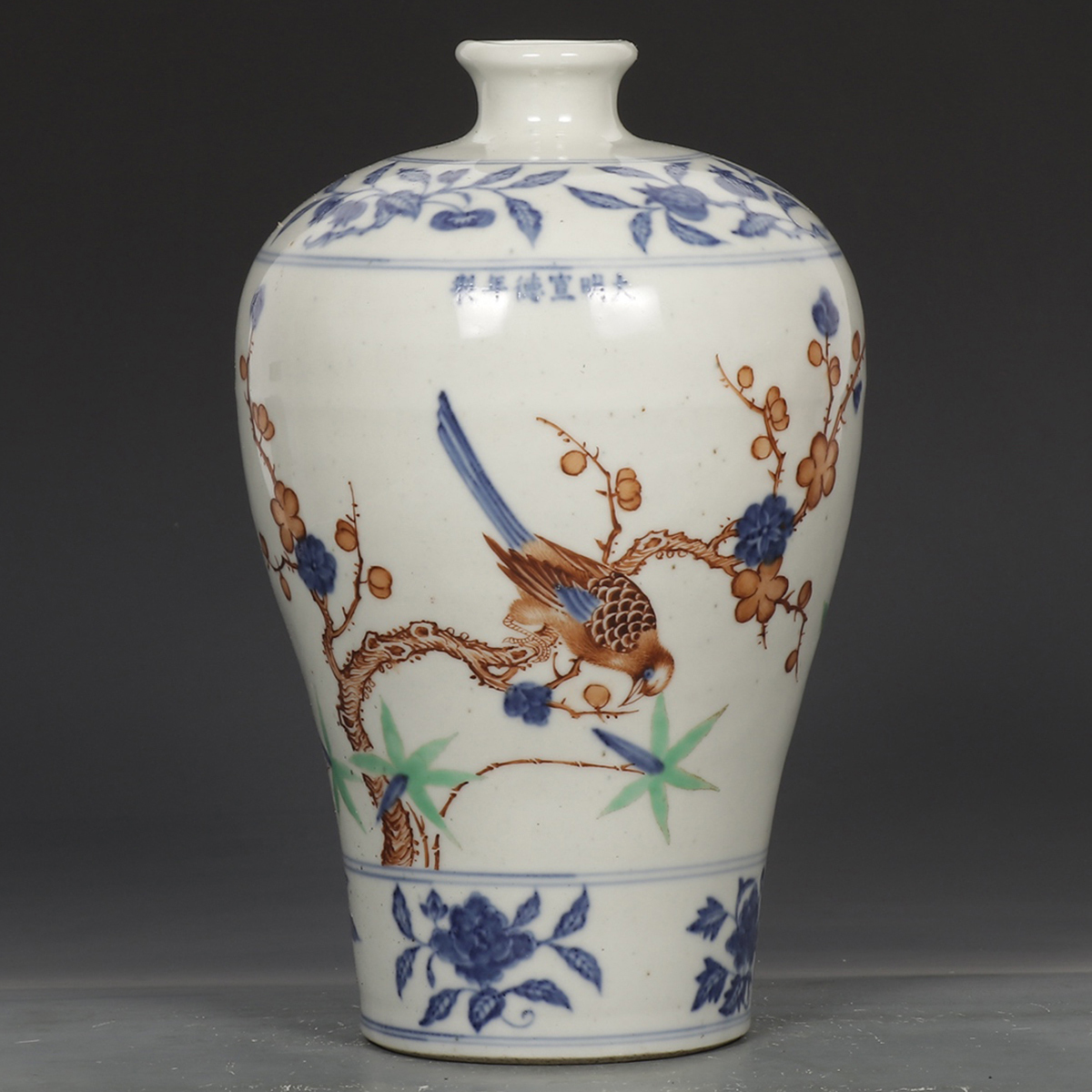 - ▽鴻▽明時代 陶磁器 大明宣徳年製 青花五彩花鳥紋梅瓶 共箱 時代物 中国古美術 骨董品