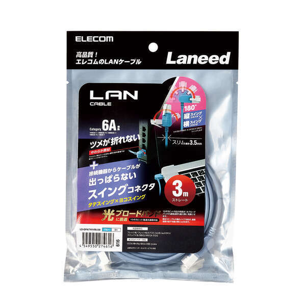 - Cat6A準拠ツメ折れ防止LANケーブル 3.0m 垂直方向に上下90度回転と水平方向に左右90度回転できるスイングコネクター搭載: LD-GPATWV/BU30