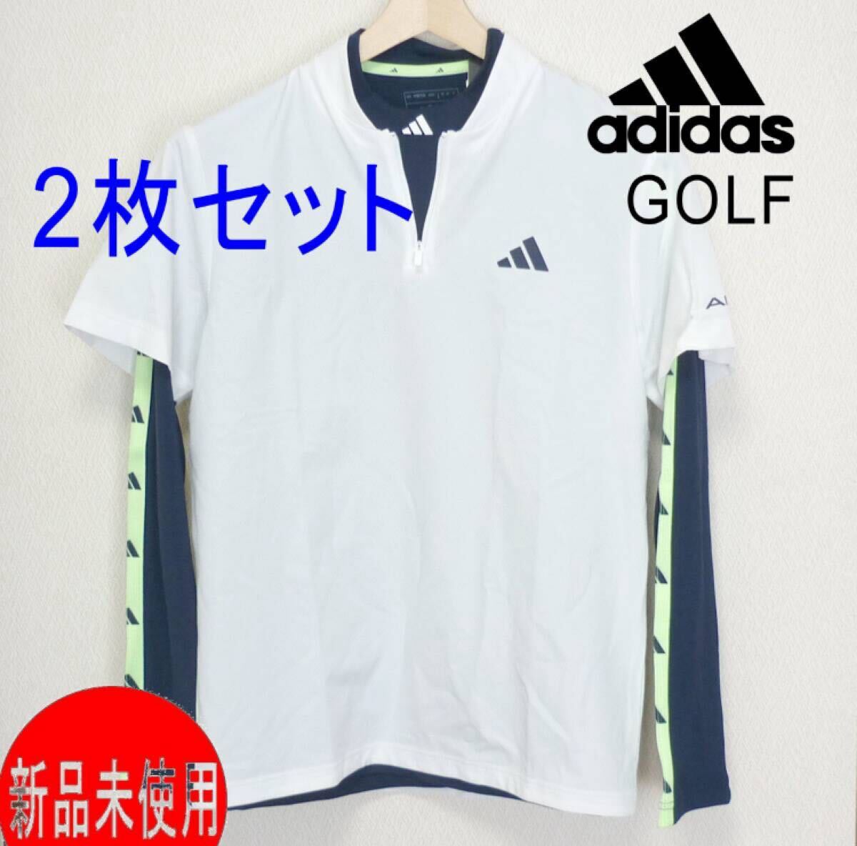 > 定価14960円新品(メンズM)アディダス ゴルフ 白×紺 BOSグラフィックレイヤードセットシャツ 2枚セット紳士服