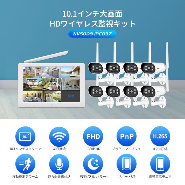 > ★送料無料・30日間保証付き★Srihomeワイヤレス防犯カメラ8台セット 10.1インチLCDモニター暗視撮影 H.265+映像圧縮技術 増設自由 NVS009