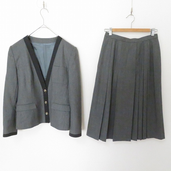 【ブランド】銀座マギー 【アイテム】スカートスーツ セットアップ ジャケット スカート 【表記サイズ】記載はスカートのみ:11【平置き実寸】(トップス)肩幅:約 41cm袖丈:約 58cm身幅:約 48cm着丈:約 54cm(ボトムス)ウェスト:約 33.5cmスカート丈:約 71cm【状態】目立った傷や汚れなし【備考】-【色】グレー系【素材】画像をご参照ください。★当店の商品はすべてリユースアイテムとなります。特質上、些細なダメージは記載しておりませんので着用に問題のない使用感、着古した雰囲気などはご了承くださいませ。キーワード/アクイール/古着/used/ビンテージ/ヴィンテージ/昭和/レトロ/スカートスーツ/セレモニー/金釦/ノーカラー/プリーツスカート