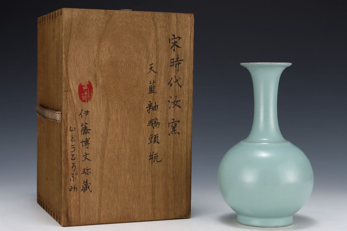 - 【永】宋時代 汝窯 天藍釉鵝頸瓶 古陶磁器 陶芸 皿 中国陶瓷器 唐瓷 置物擺件 古美術品 古賞物 収集 旧家蔵出 中国唐物 A798