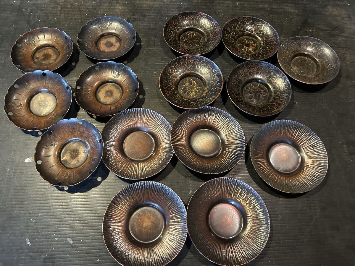- 茶托 まとめて 15枚 3種 銅製 茶道具 茶器 煎茶道具 時代物 金属工芸 栄美堂