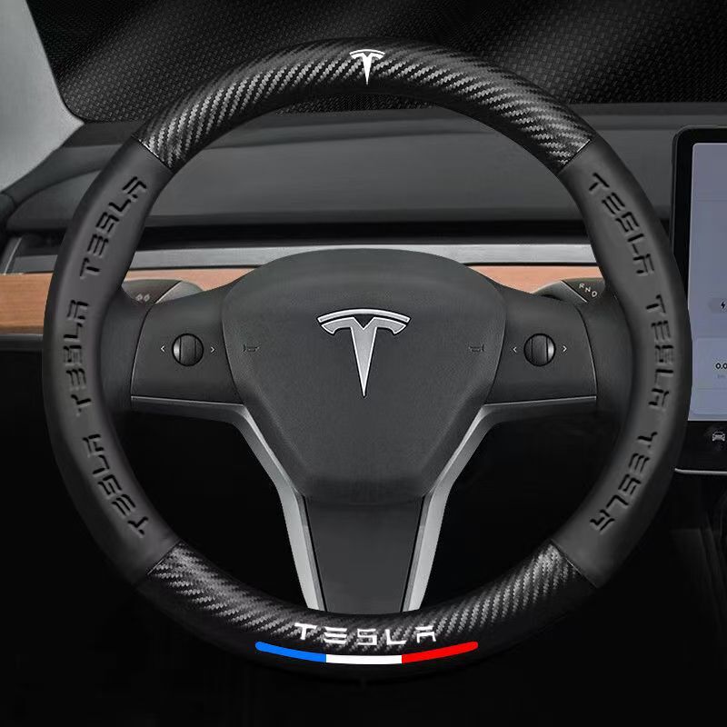- テスラ TESLA 専用 ハンドルカバー ステアリングカバー 円型 本革 上質な逸品【美品】 カーボン調
