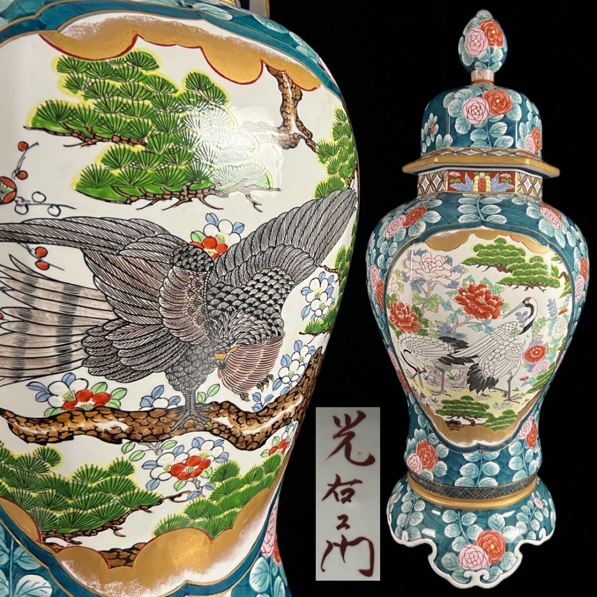- 古美術品 有田焼 光右衛門 本人作 染錦花鳥図沈香壺 特大86cm 細密絵付 時代物 大花瓶 飾壷 置物 沈香壷 金彩色絵 唐物骨董[麌]