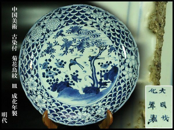 - 【金閣】中国美術 古染付 菊花鳥紋 皿 φ35.5cm 成化年製 明代 旧家蔵出 送料無料(XA957)