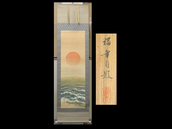 - 【心庵】掛軸 小西福年 絹本「紅日青波」日の出図/肉筆 共箱 真作 正月 A1087