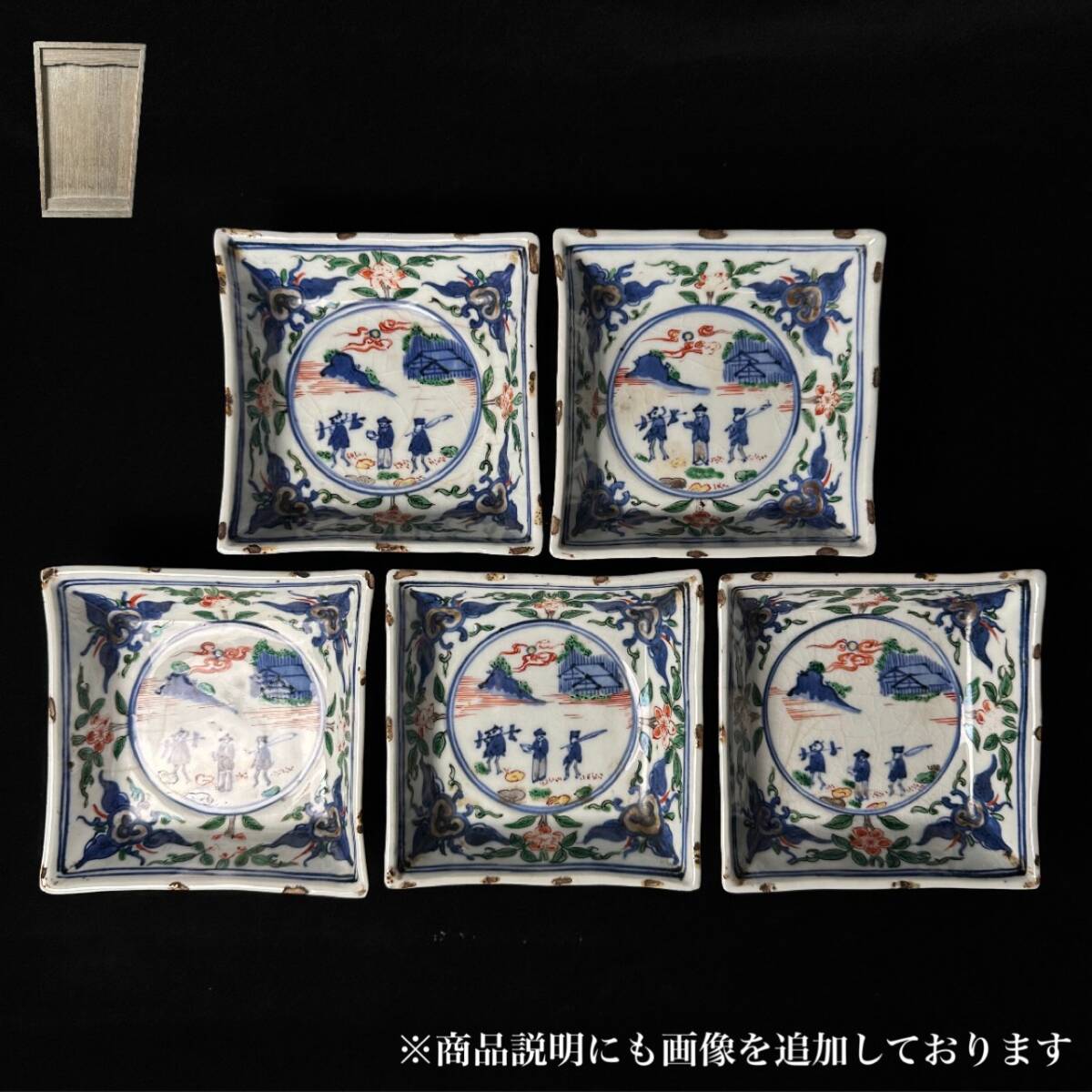 > コレクター買取品 中国美術 天啓赤絵 角皿 五客 五彩 人物紋 木箱付 唐物 向付 懐石料理 食器 中国古玩 飾物 置物 時代物