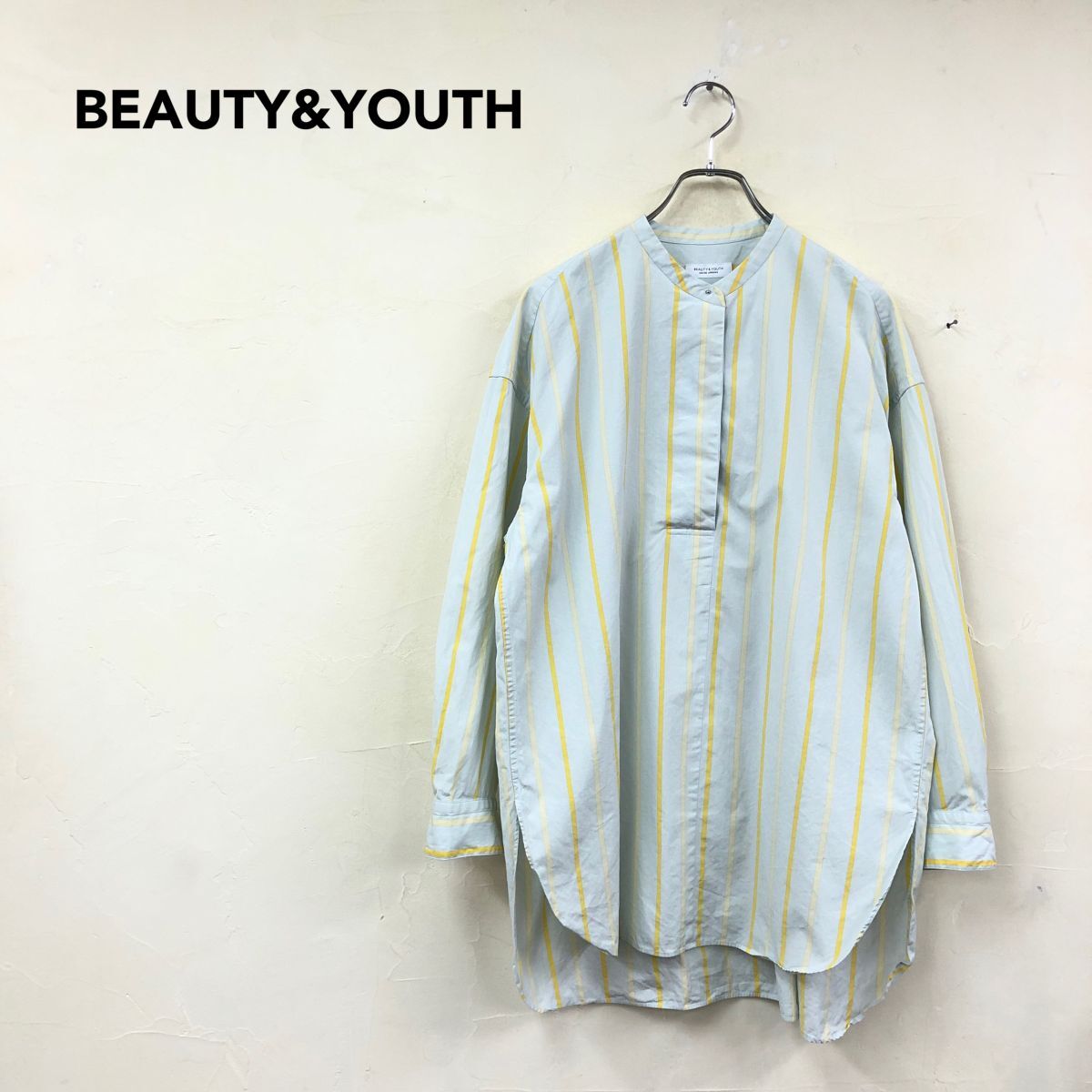 > 2O2283-K◆日本製 BEAUTY&YOUTH ビューティーアンドユース バンドカラー長袖ロングシャツ◆グリーン系 ストライプ ハーフボタン カジュアル