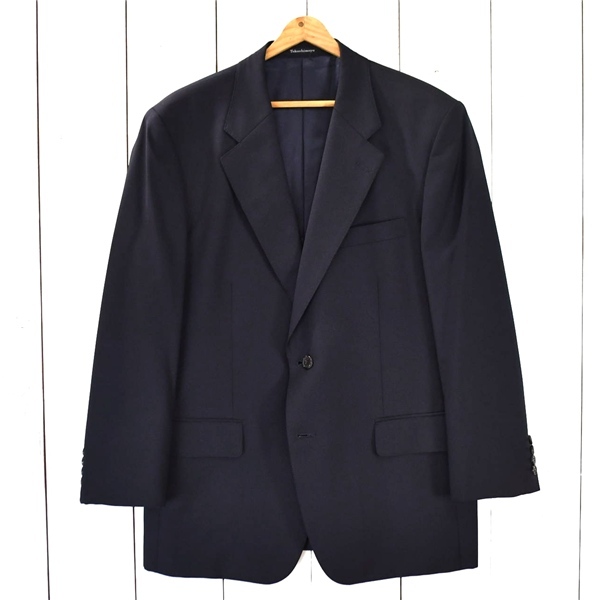 2つボタンシングル。フラップポケット。センターベント。袖口4つボタン。開き見せ。背抜き。ネーム刺繍あり。この機会に是非!