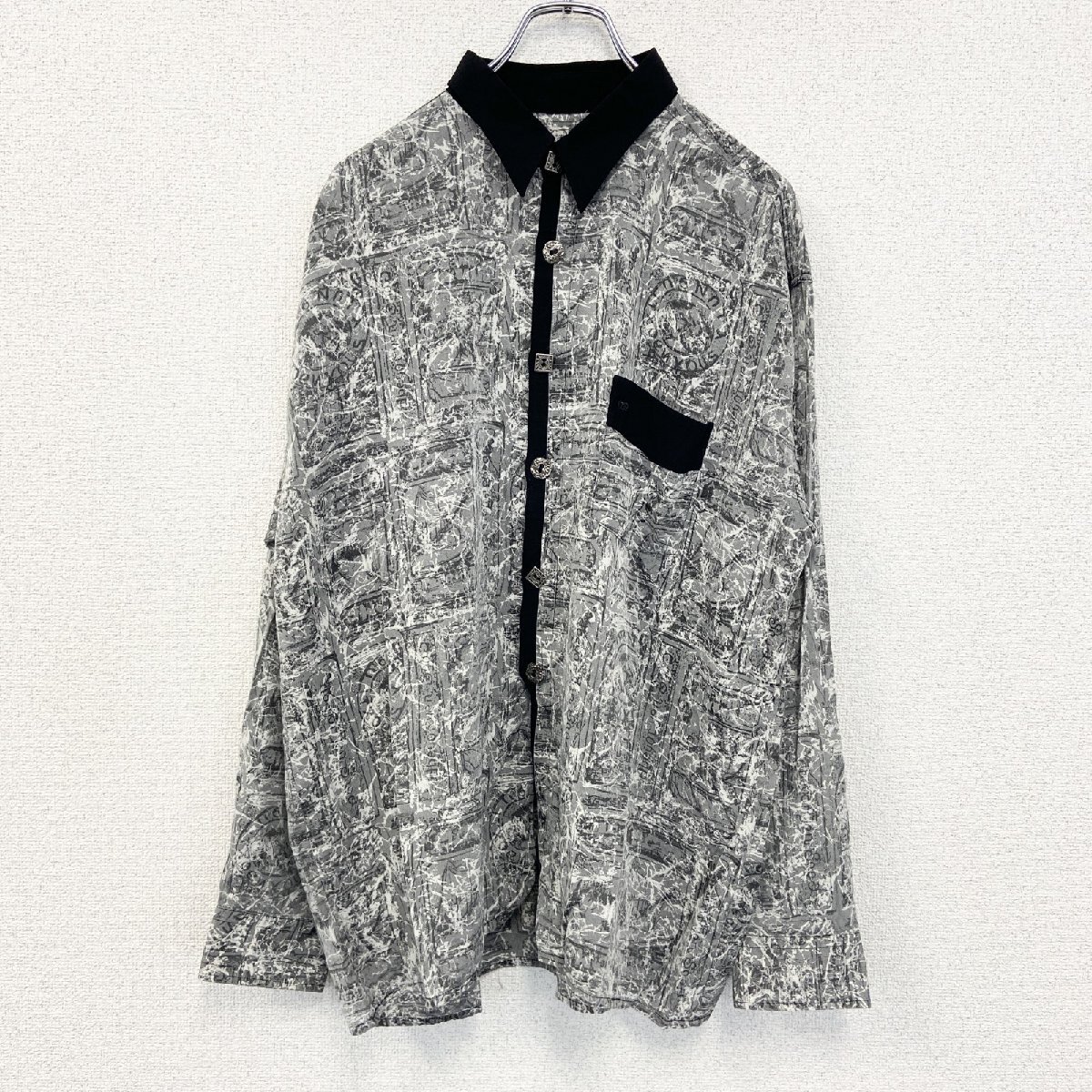 - 古着 used Maurice Emde 長袖総柄シャツ 個性的 イタリア製 ポッケ付き レトロデザイン カジュアル Lサイズ