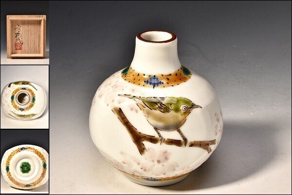 > U08748 東京芸大 高橋誠 色絵 桜に目白図 花器 一輪差 共箱 色絵磁器 /G241