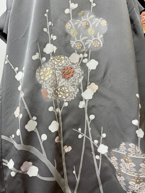- 5886/未着用訪問着/グレーに梅の木模様(金箔・刺繍あり)で前はサイド、後ろはW切替の2WAYワンピース♪着物リメイク♪入学式~結婚式~