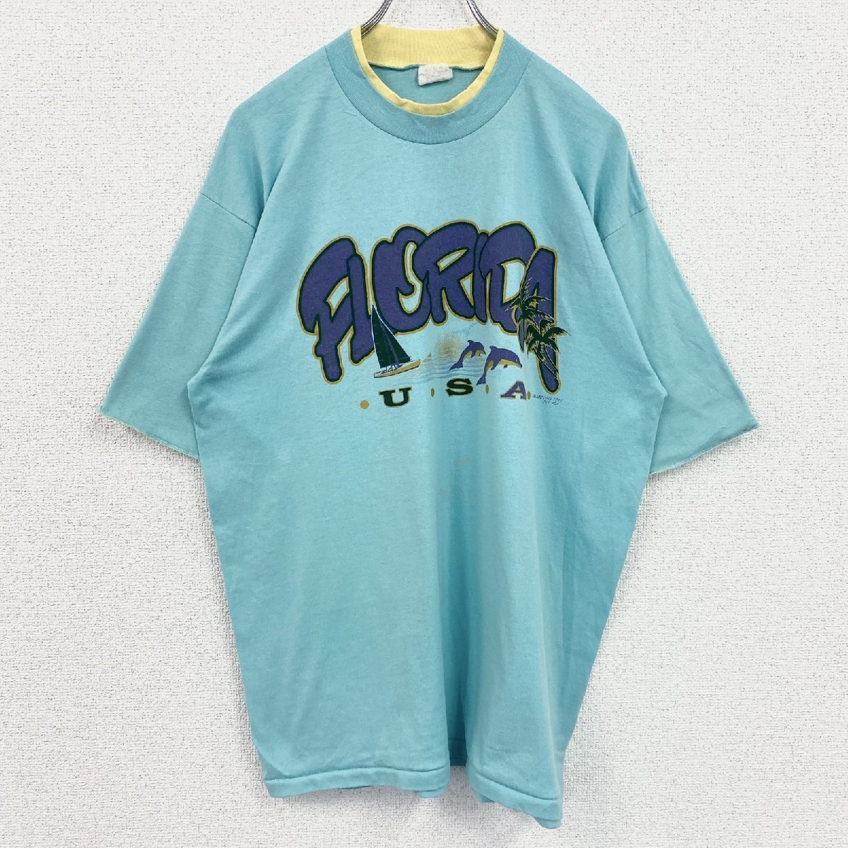 > 古着 used 90s 1994 半袖プリントTシャツ ヴィンテージ クルーネック レトロデザイン 水色 ライトブルー XLサイズ
