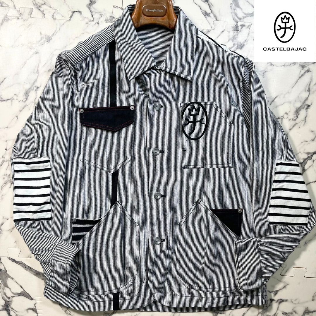 > 極美品/パッチワーク/48(L) ●カステルバジャック Castelbajac ヒッコリー デニム ジャケット カバーオール ボーダー切替 グレー 家紋