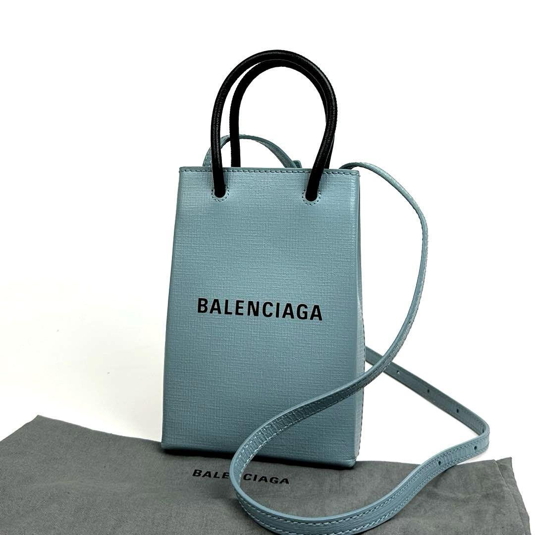 - 【極美品】BALENCIAGA バレンシアガ ショッピング フォンホルダー ショルダーバッグ 2way ハンドバッグ 斜め掛け レザー 水色 ブルー