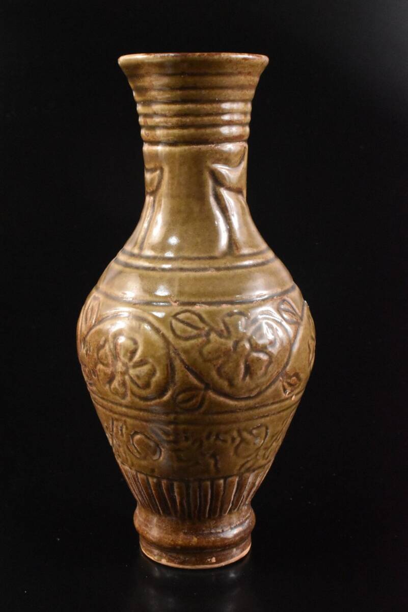- 【雲】某資産家買取品 中国古玩 青磁花唐草彫刻花瓶 飾壷 古美術品(花器花入旧家蔵出) F8016