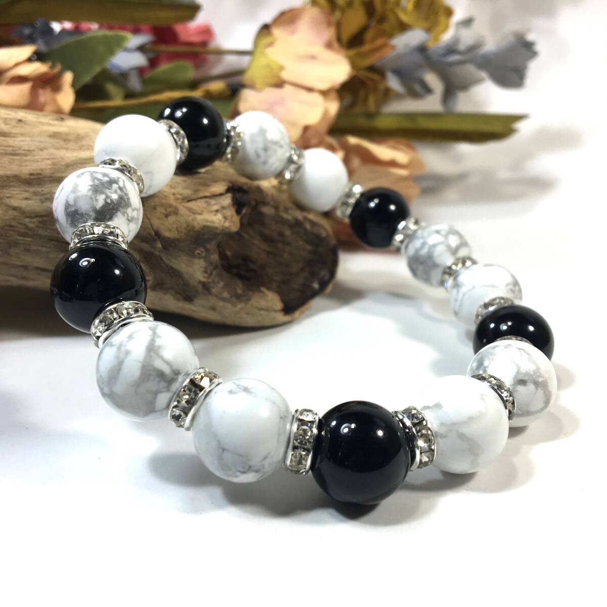 - ハウライト&オニキス パワーストーン ブレスレット 天然石ブレス (シルバー) 12mm 幸運 開運 メンズ 男性♪