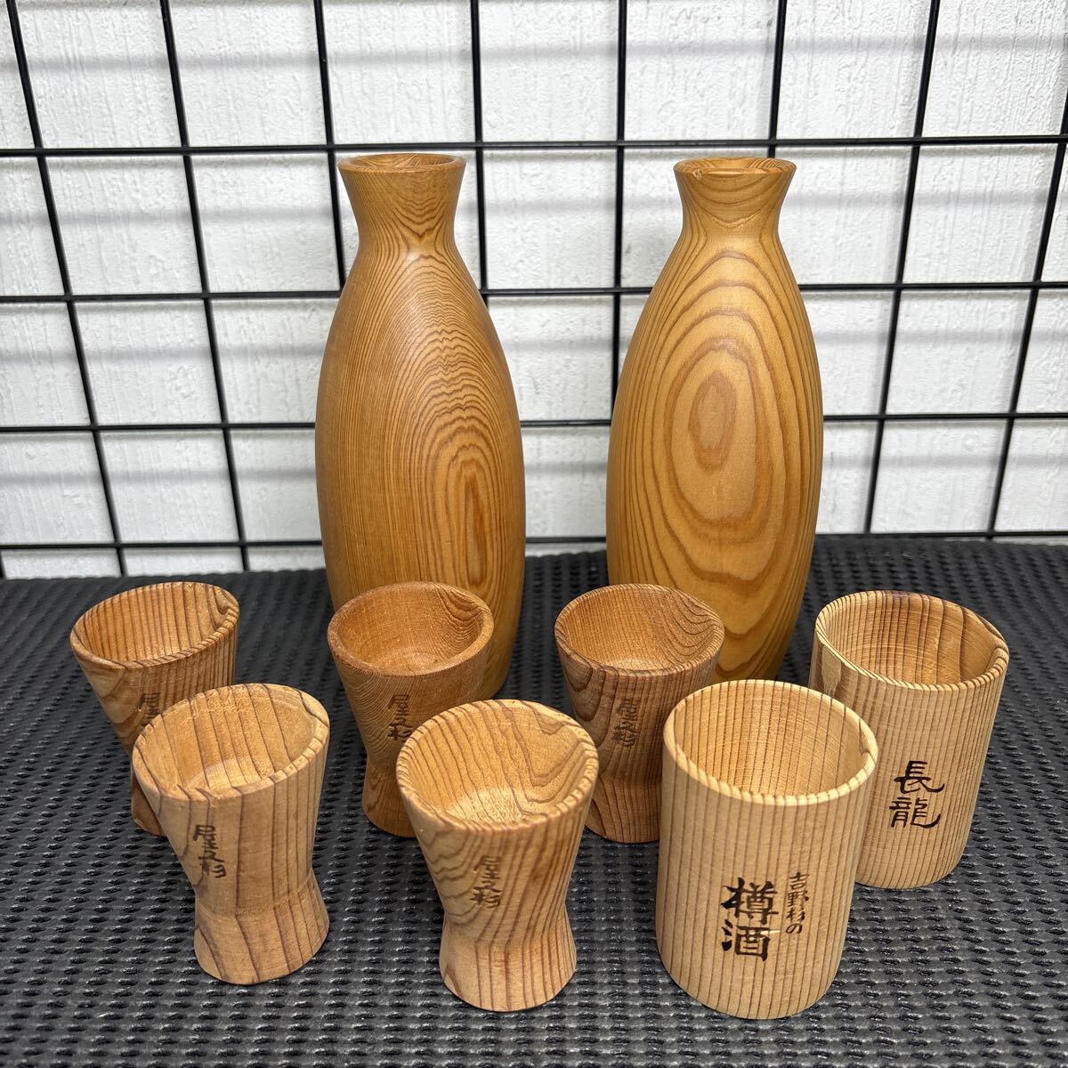 - ★大阪/店舗受け取り可★木製 徳利・お猪口セット 酒器揃い 9点セット 屋久杉 ロゴ入り 銘木吉野杉 長龍・樽酒など 酒器★