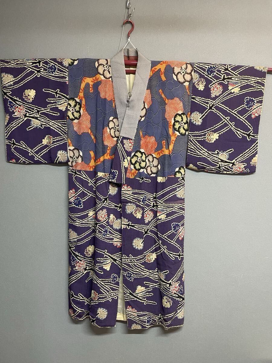 - (B) 長襦袢 松葉散らし 紫 梅 正絹 古布 リメイク素材 アンティーク 縮緬 ちりめん 裄 58 丈 119
