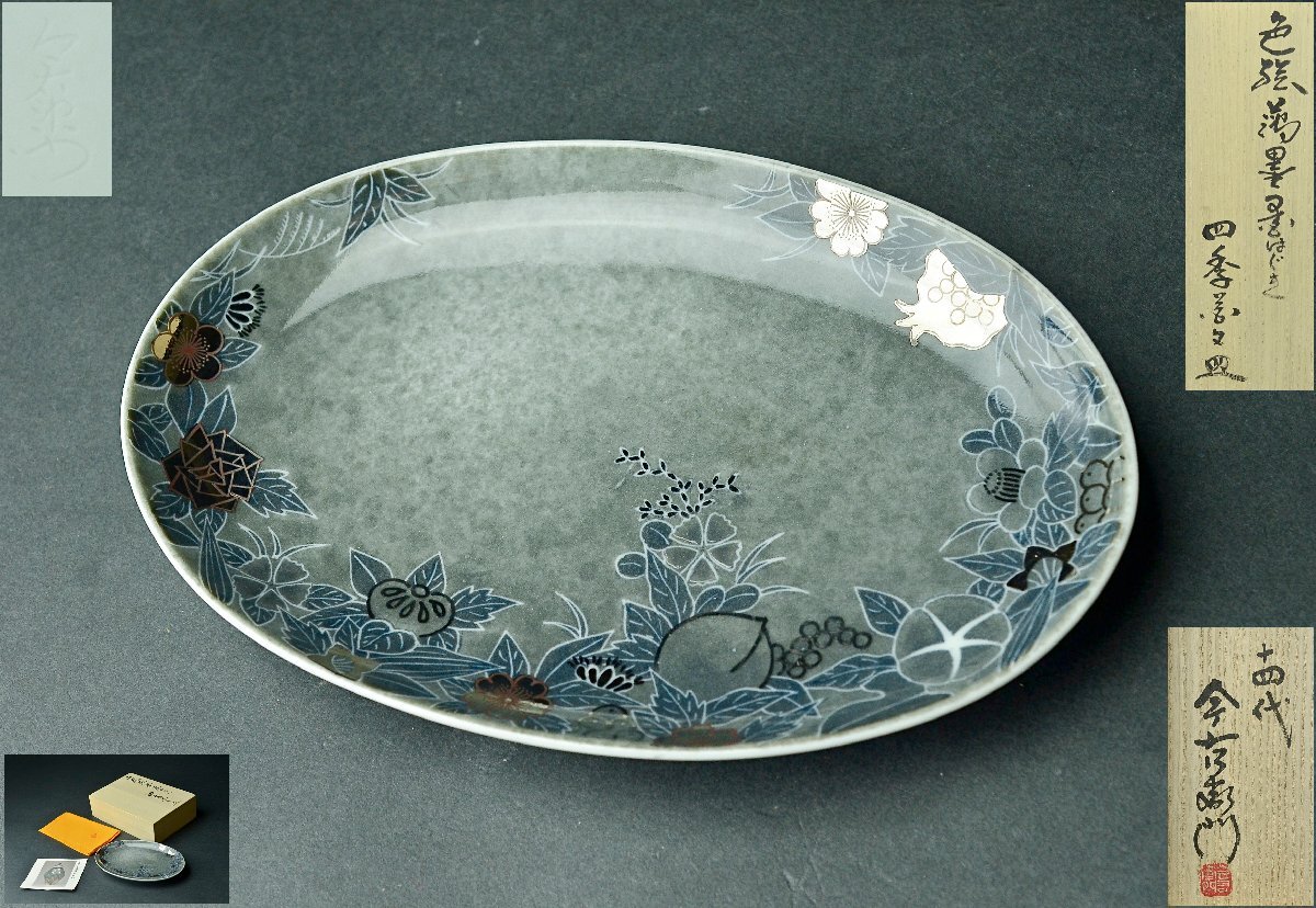 > 【YB】十四代今泉今右衛門『色絵吹墨墨はじき四季花文皿』人間国宝・共箱付属 径19.7cm ★額皿鍋島焼色鍋島絵皿大皿25Y969-1