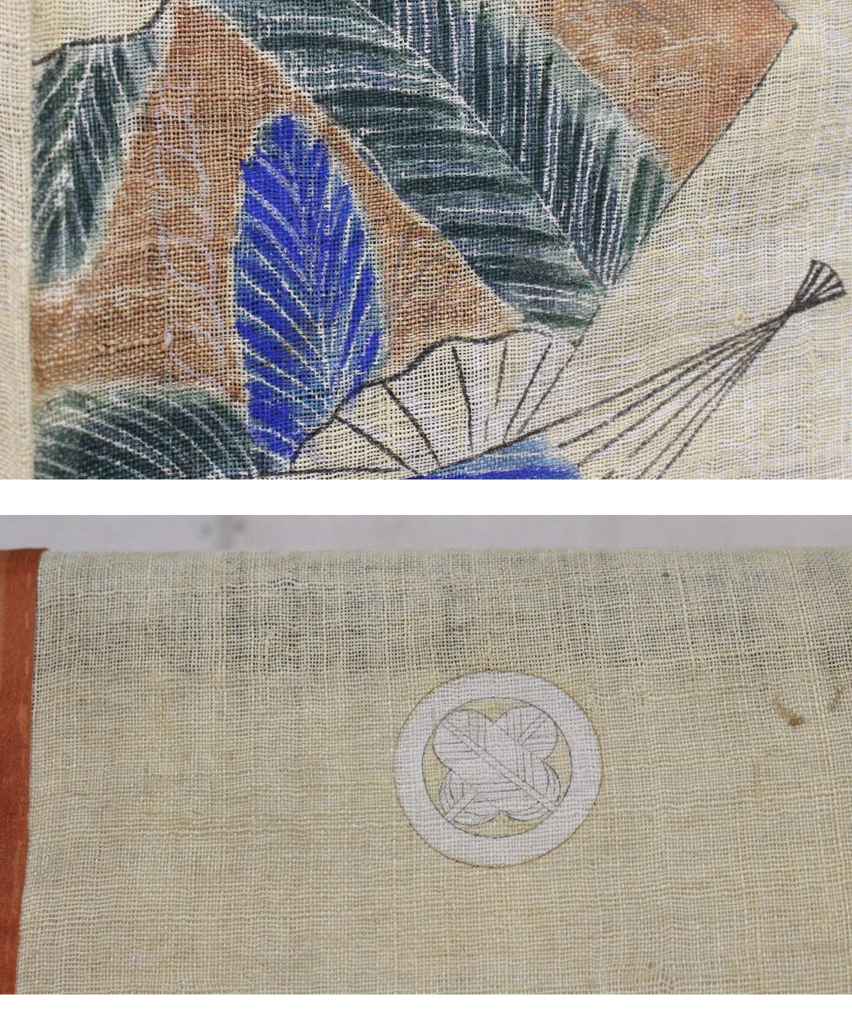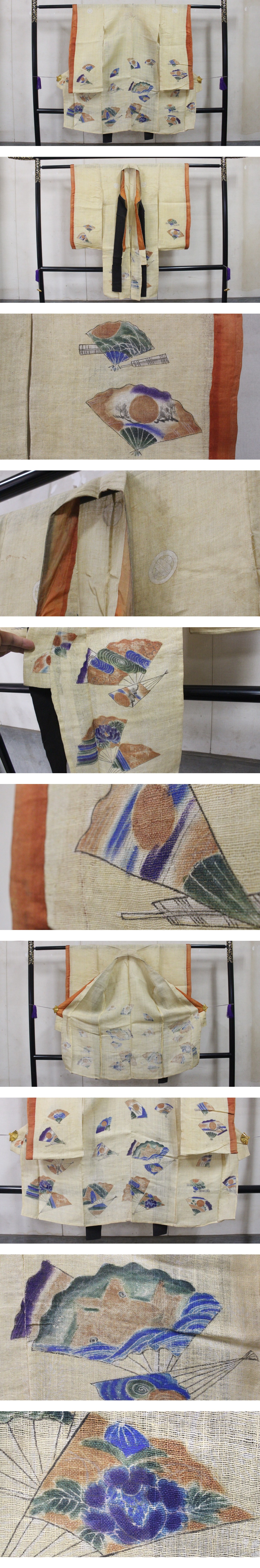 - 紋付 麻 扇子絵 子供 祝着 着物 祝い着 時代物 古布リメイク生地 エ87
