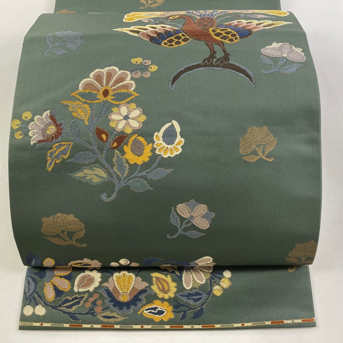 - 袋帯 秀品 落款 関西仕立て カシャワール孔雀文 孔雀 草花 金糸 箔 灰緑 六通 正絹 【中古】