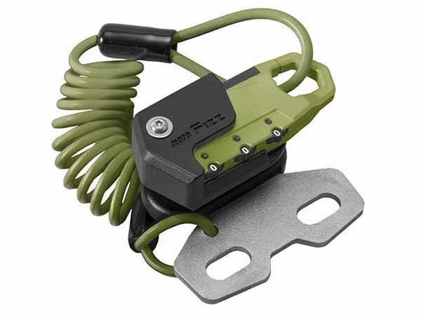 タンクに近い位置のハンドルクランプに取り付け出来るヘルメットワイヤーロック。