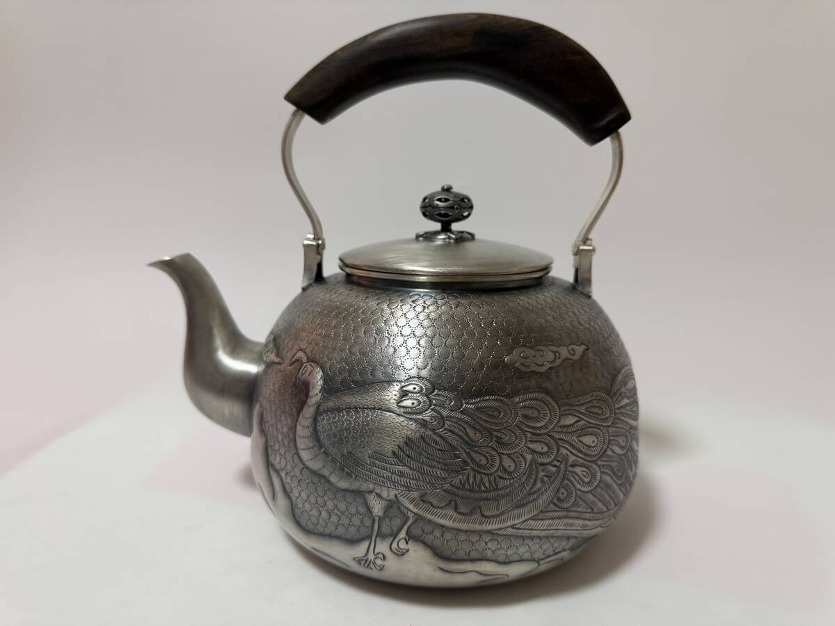 - 時代 純銀製 中川浄益造 孔雀文 透摘 湯沸 工芸品 古美術品 銀瓶 煎茶道具 重さ1497G