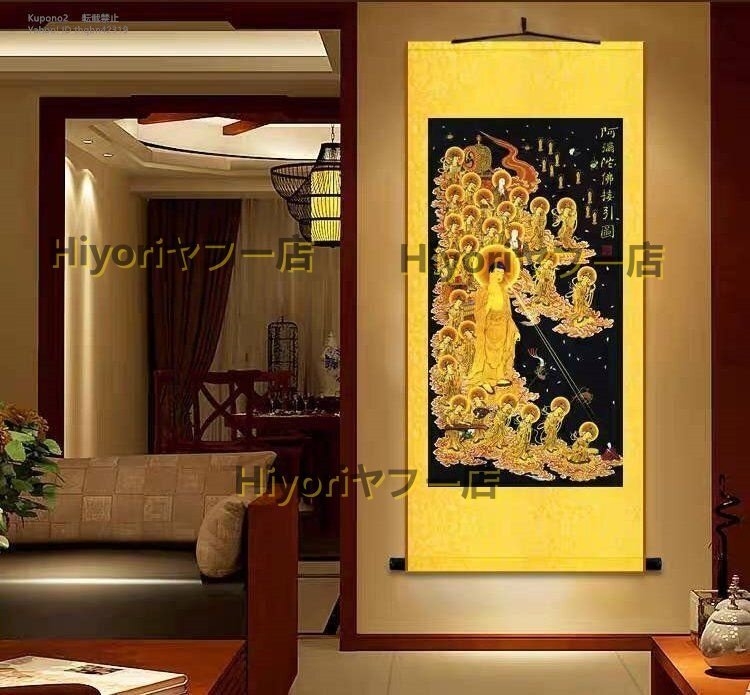 - 【仏画】 掛軸 絹本極彩色画 阿弥陀如来 西方三聖 観音菩薩 接引図画像掛軸 お仏壇の長谷川 仏事法要掛軸