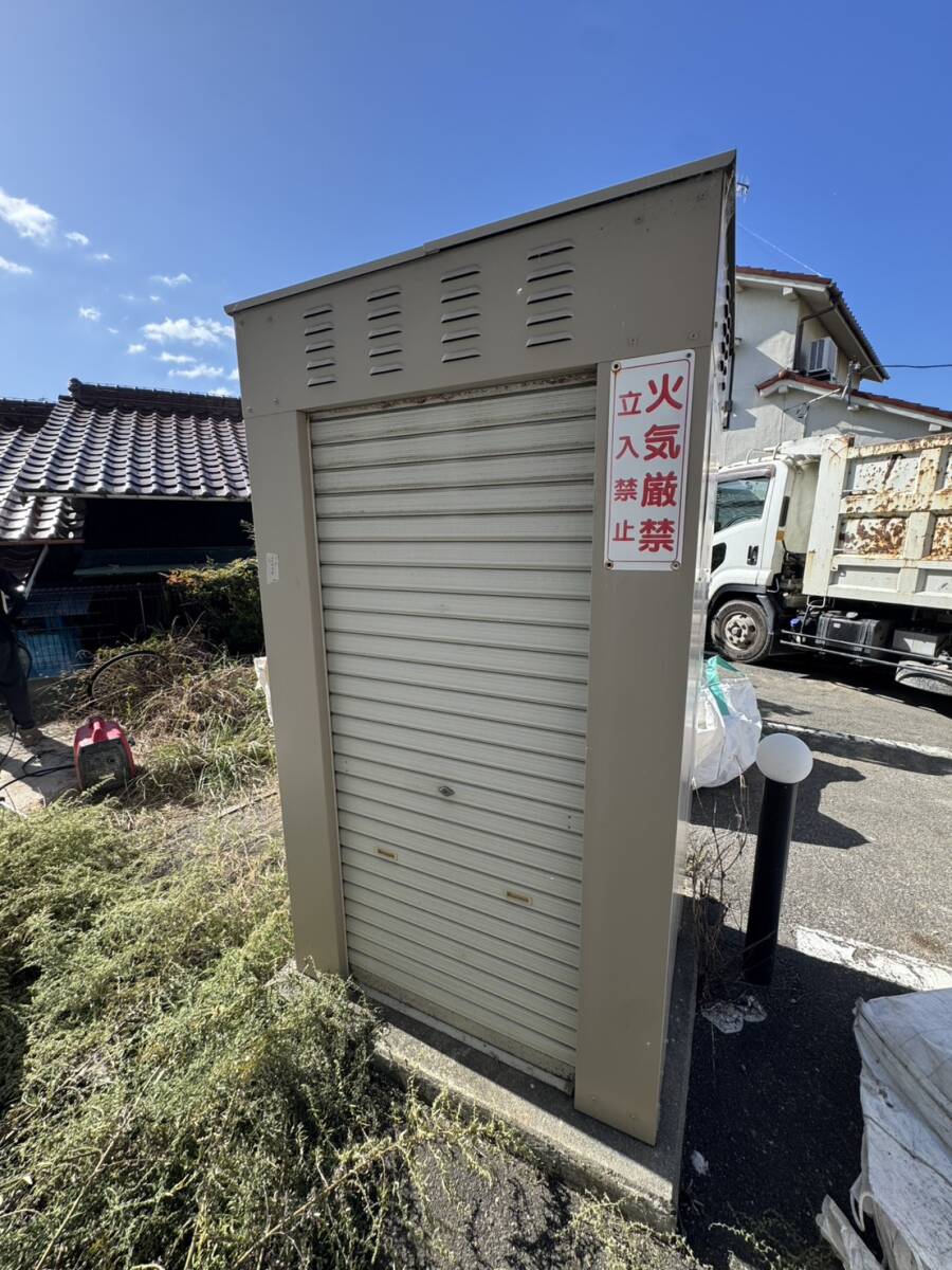 > 100998 軽量鉄骨倉庫 小型物置 ガスタンク貯蔵庫 シャッター付き 分解撤去済みセット ガレージ車庫倉庫事務所に 西