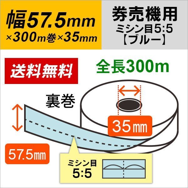 - 送料無料 芝浦 KC-TXシリーズ (KC-TX20NN/KC-TX10NN) 対応 汎用券売機用ロール紙 裏巻 ブルー (ミシン目5:5) 150μ (5巻)