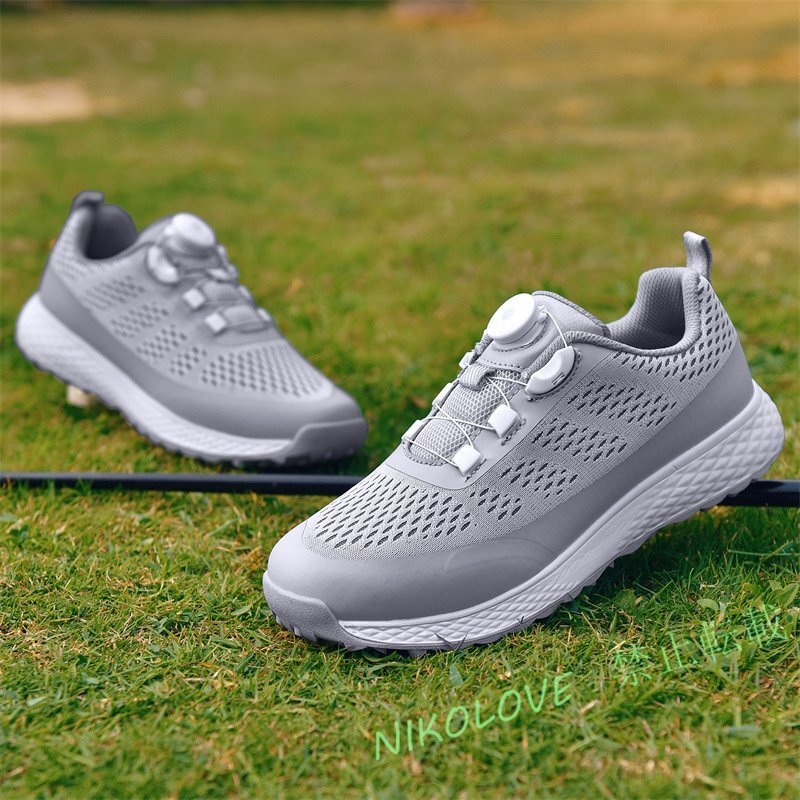 > メンズシューズ ゴルフシューズ 軽量 通気性 スニーカー メッシュ スポーツシューズ 運動靴 カジュアル 幅広 ダイヤル式 灰系 24.5cm~28cm