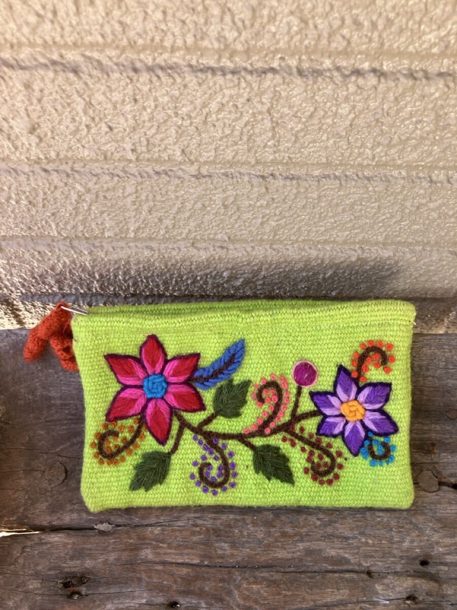 - ガイジンメイド、手織りウール花柄刺繍ZIPポーチ グリーン-B