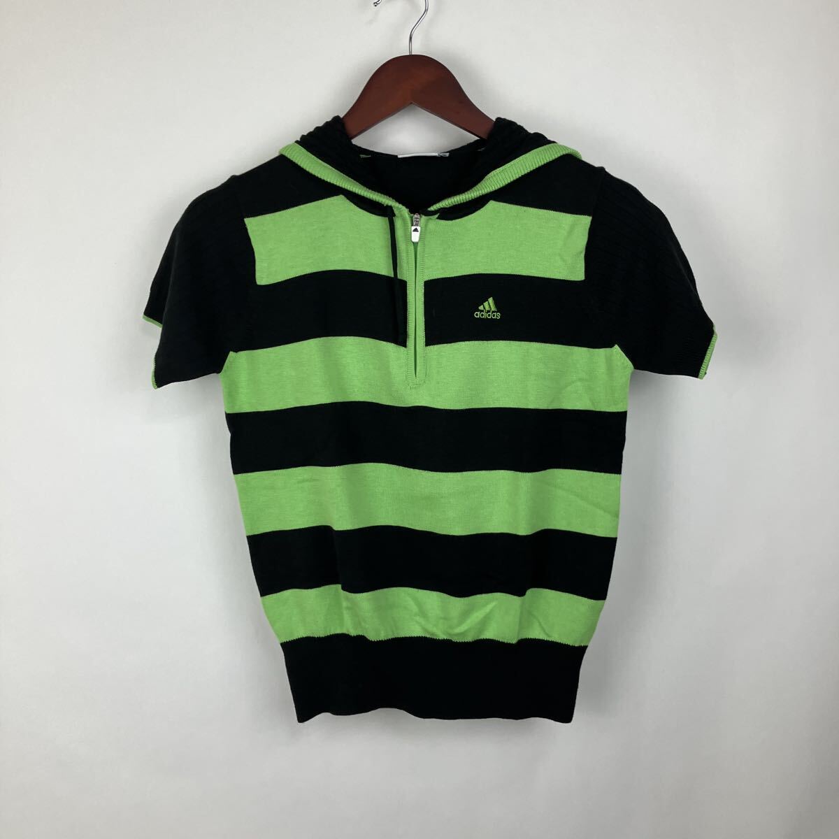 > adidas アディダス ボーダー ポロシャツ 半袖 トップス カットソー グリーン Tシャツ ボーダー柄 Sサイズ グリーン ハーフジップ