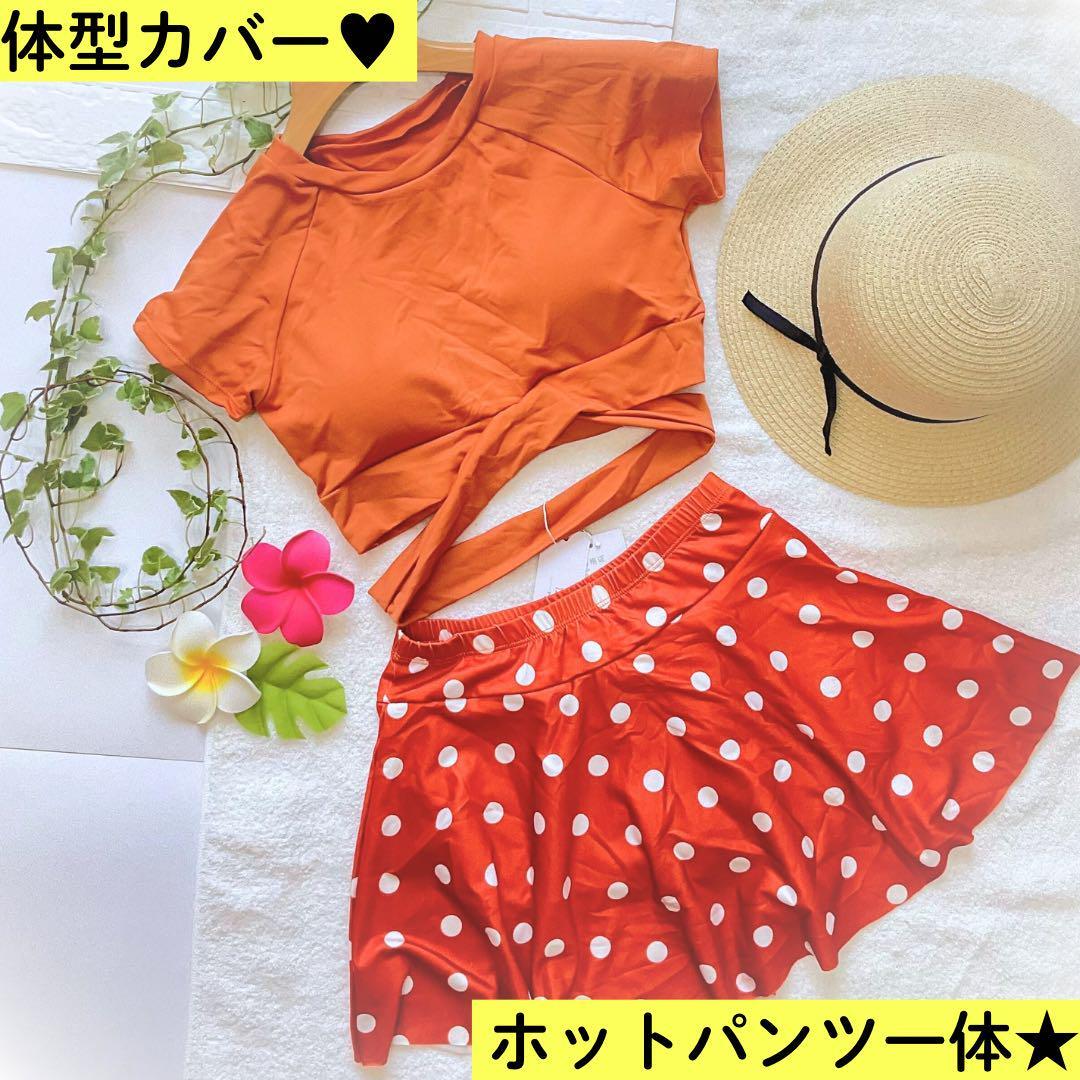 - タンキニ 水着 大人かわいい 体型カバー 上下 韓国 セパレート オレンジ 水玉 プール 室内プール