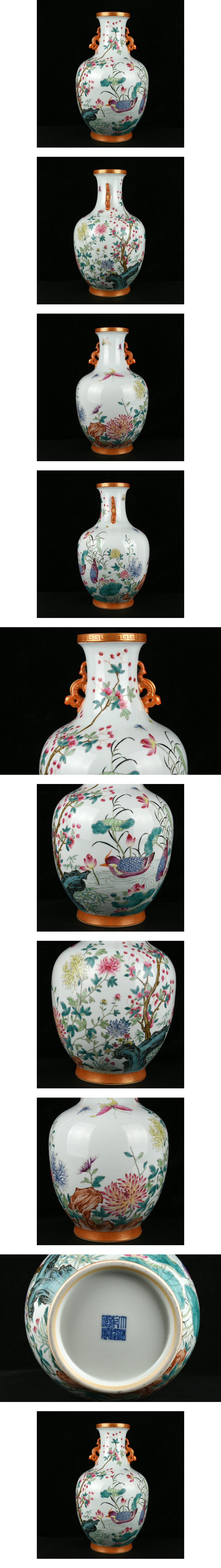 > ◆珍蔵◆中国古美術 大清乾隆年製款 粉彩 古陶磁 荷花 鴛鴦紋双耳瓶 細密細工造 擺件 骨董品 古賞物 時代物 T16