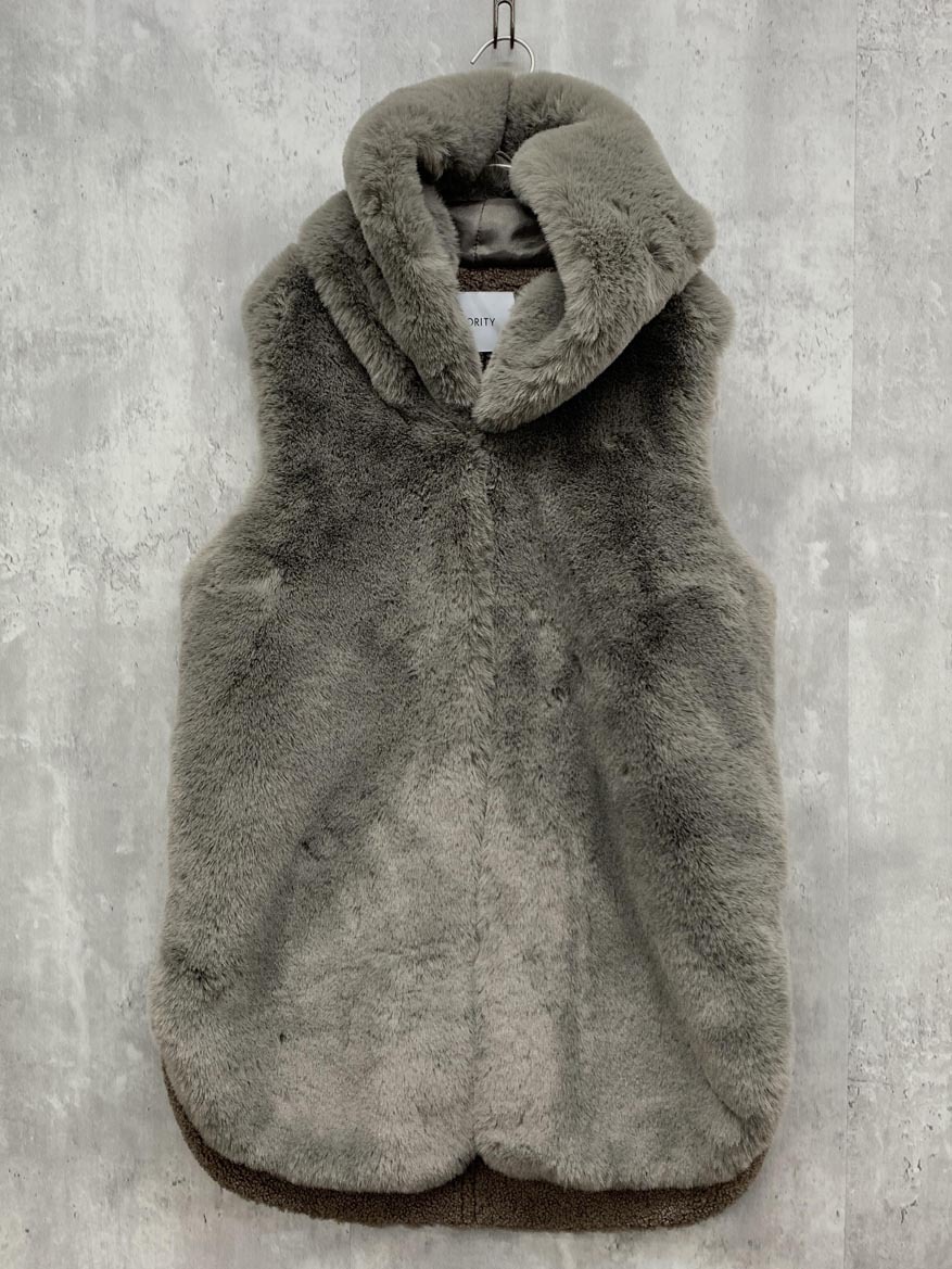 - 美品 PRIORITY プライオリティ 77-P20121 フェイクファー フェイクムートン切替 ベスト size38/グレージュ ◆■◎ ☆ fjc1 レディース