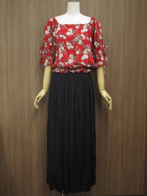 > 美品 anywise等 五分袖POブラウス+ロングプリーツスカートコーデ2点セット L相当 赤地 白×青×ベージュ 花柄/黒 ガーリー系 20代・30代~