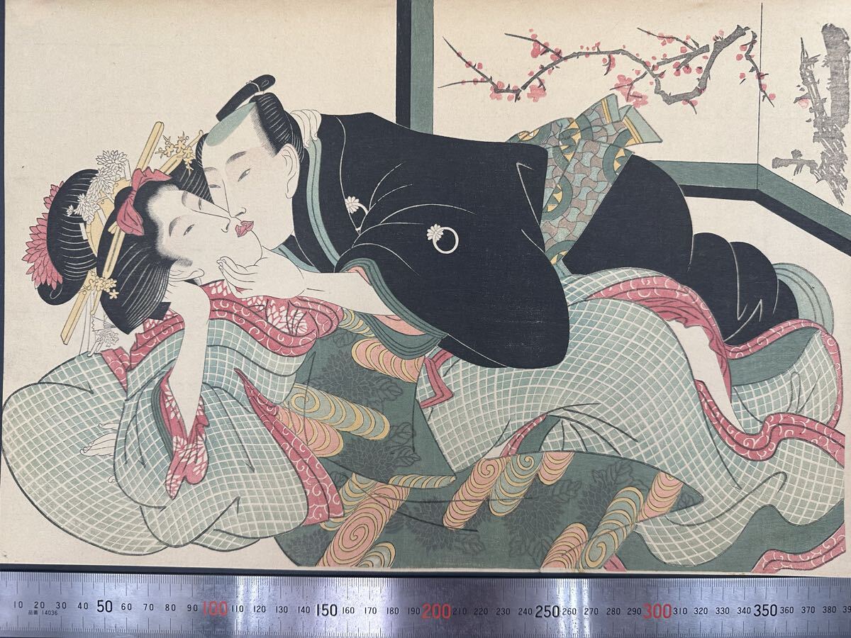 - 【真作】大正期 浮世絵木版画 菊川英山「売春婦と男のキス」あぶな絵 美人画 大判 錦絵 保存良い