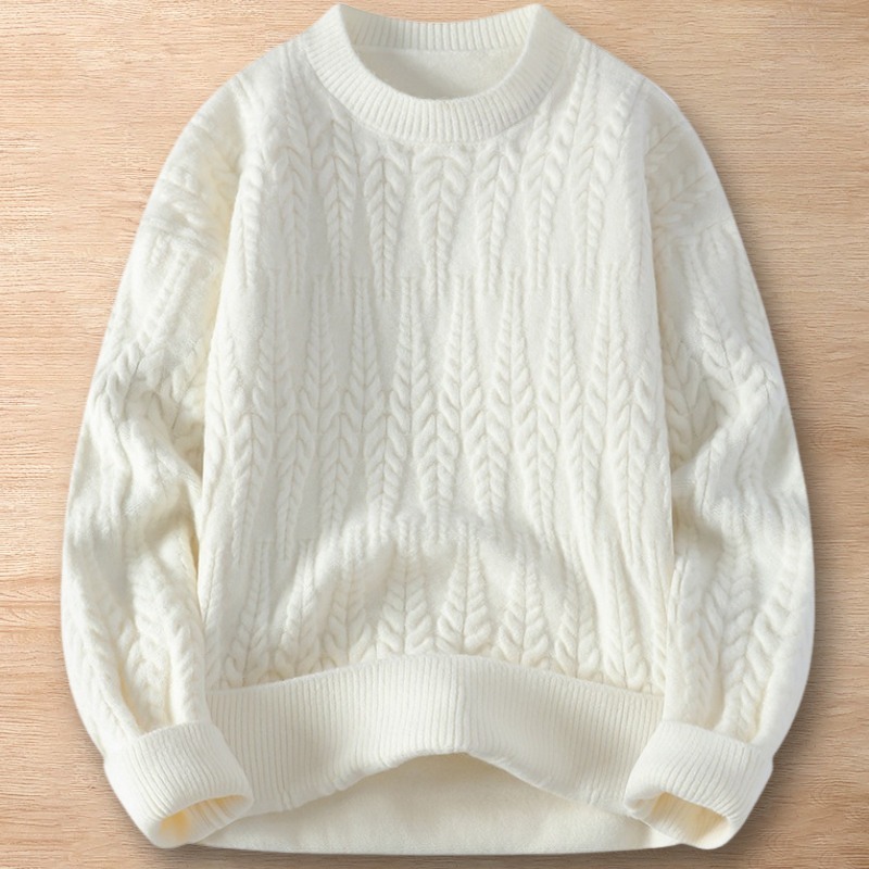 - Y081-L ホワイト 新品DCKMANY 無地ニット ケーブル編みセーター ウール混 ラウンドネック 秋冬トップス 厚手 暖かい メンズ プルオーバー
