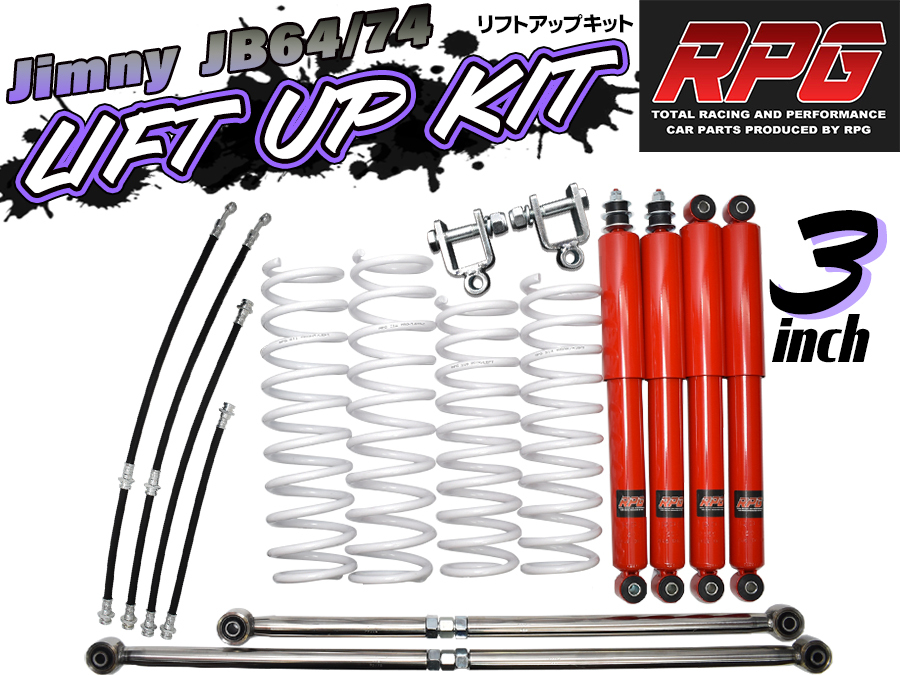 > ジムニー JB64W JB74W 3インチ リフトアップキット RPGロングショック赤 ステンラテ コイル白 ロングブレーキホース・延長ブラケット付き