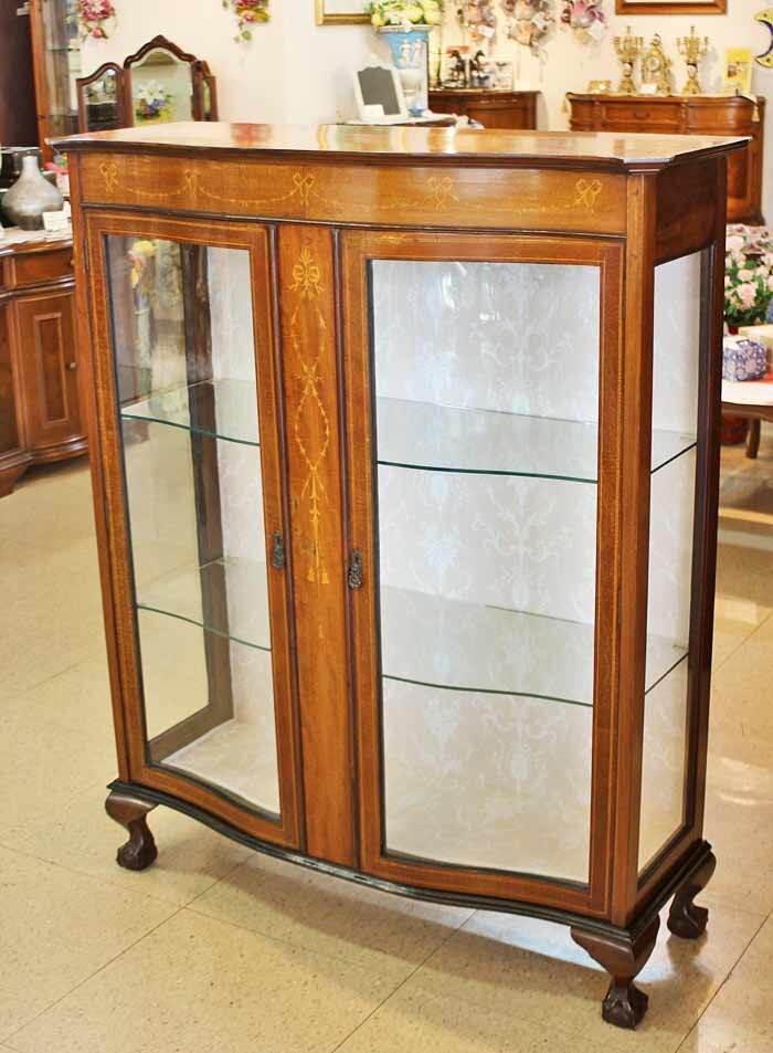 英国アンティーク キャビネット キュリオケース 飾り棚 リビングスタジオ 象嵌 ネコ脚 クラシック ビンテージ 関東直接納品無料 CE-52