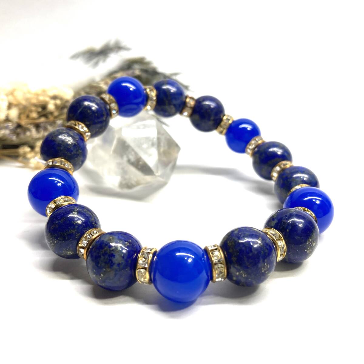 > ラピスラズリ&青瑪瑙 パワーストーン ブレスレット 天然石ブレス (ゴールド) 12mm 幸運 開運 メンズ 男性♪