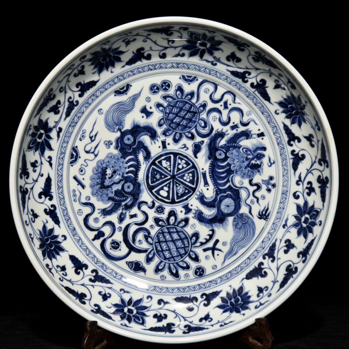 - 【永】元時代 大元國至正九年 青花 獅子戲球紋盤 古陶磁器 陶芸 皿 中国陶瓷器 唐瓷 置物擺件 古美術品 古賞物 収集 旧家蔵出 中国唐物 A4