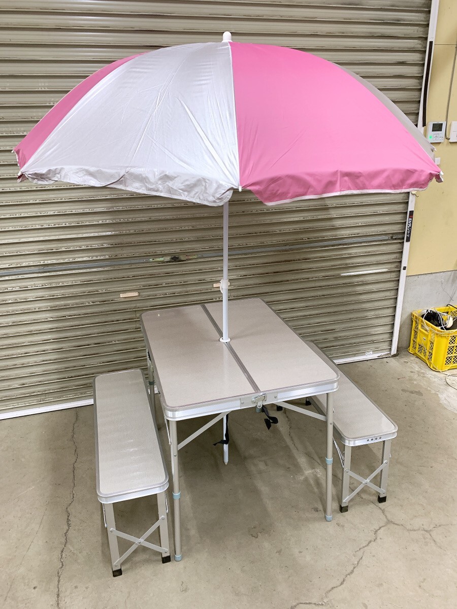 > 中古 アルミピクニックテーブル&ベンチ パラソル セット 折り畳み アウトドア キャンプ BBQ イベント 行事 茨城県常陸大宮 1023こ2 E2 170