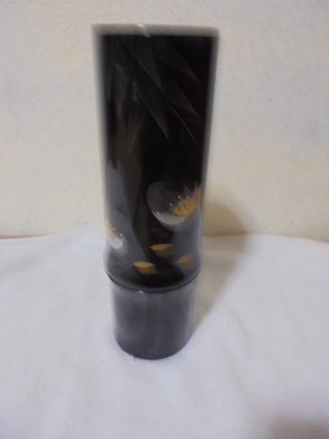 - 漆芸 竹筒型花瓶/樹脂製/円筒形 黒塗り 金泥 雀の絵/香月 作?/和風・床の間用花活け/
