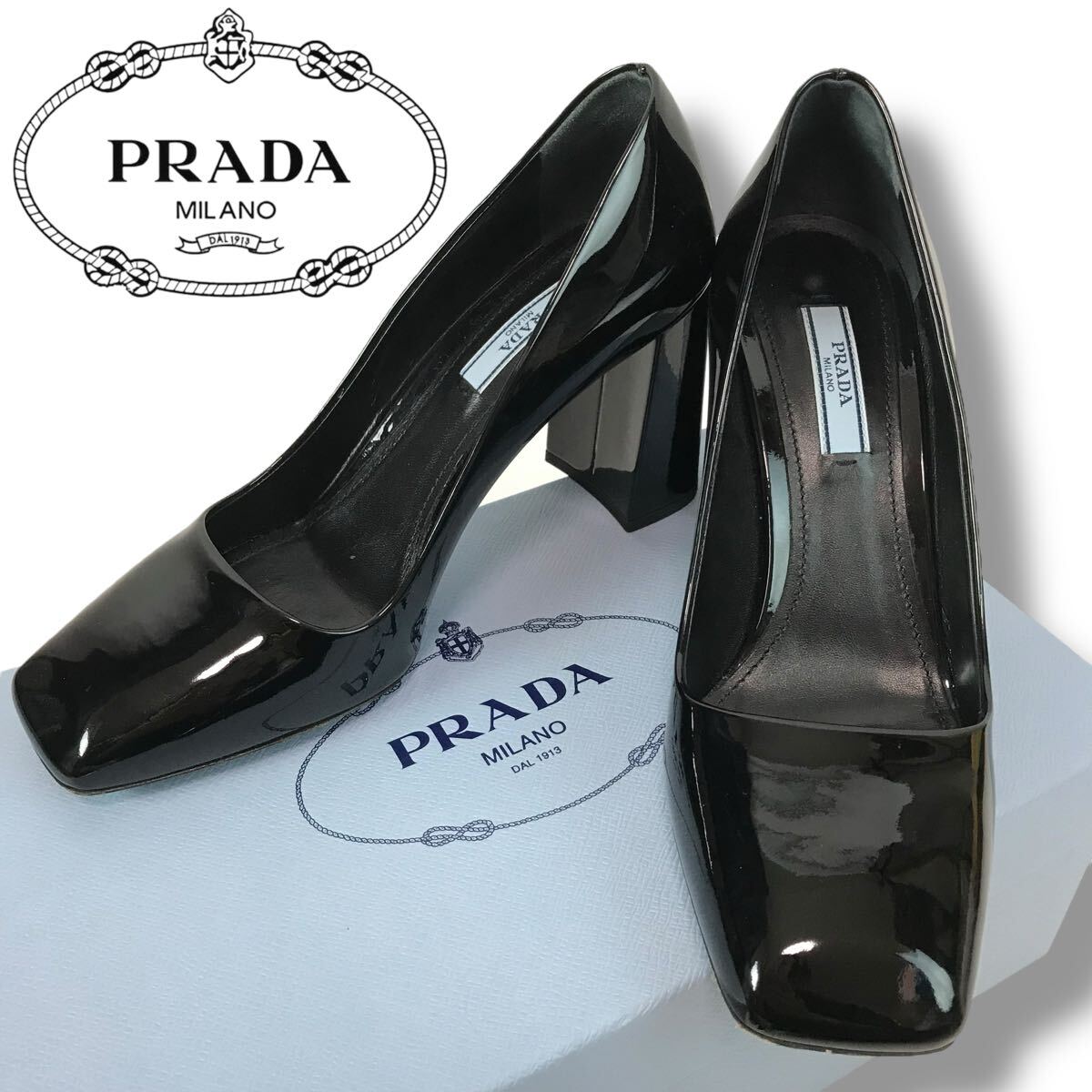 > d232 良品 PRADA プラダ エナメル パンプス パテントレザー ハイヒール BLACK 36.5 イタリア製 正規品 フォーマル シューズ スクエアトゥ